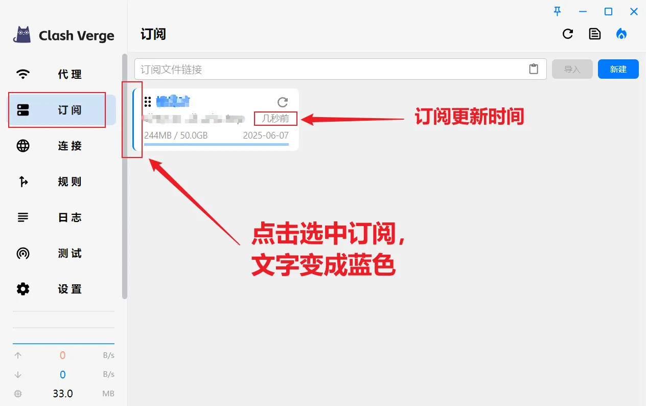 打开 Verge Rev,左侧点击 订阅 ,查看导入的订阅配置;