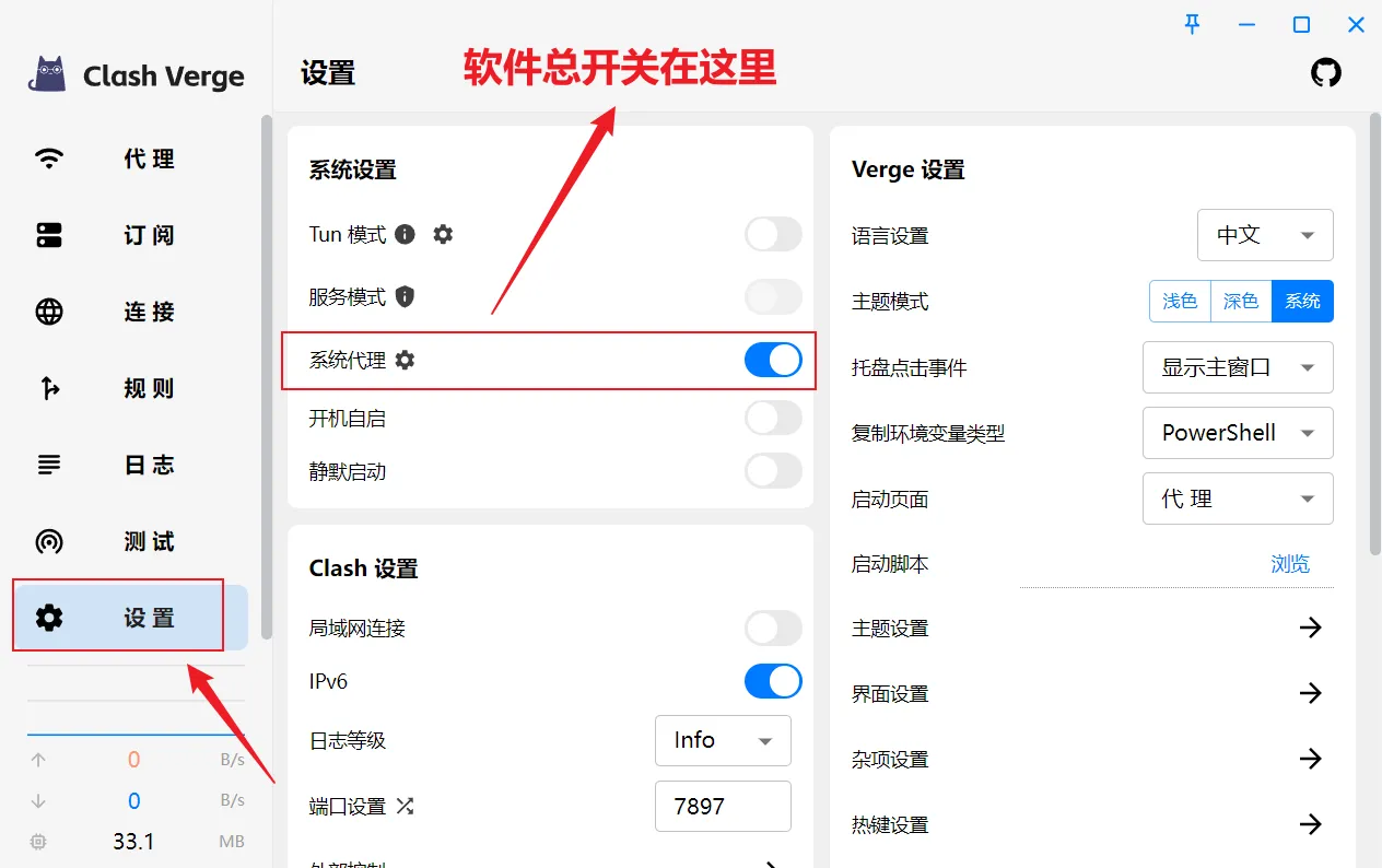 打开 Verge Rev,点击左侧 设置 - 右侧 系统设置里面有个 系统代理 开关,这个就是 Verge Rev 的总开关,也是系统代理开关;